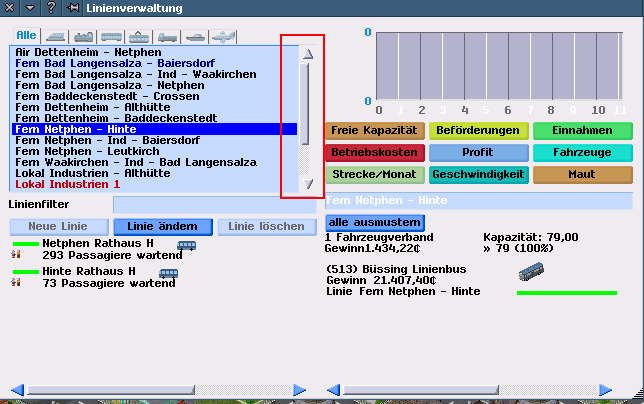 RE: [120.2.2 - Theme-Support] Zeilenhöhe - Wurzelgnom - 21-05-2018 120.2.2 r8163 / 120.2.3 r8447 Der senkrechte Scrollbalken in der Linienverwaltung ignoriert scheinbar die Breitenangabe. Die unteren waagerechten mitteln zu den Pfeilen. Der senkrechte tut es nicht. Da die Pfeile trotz kleinerer Grafik mittig sind gehe ich davon aus das es nicht an der Grafik der Pfeile liegt. Einträge in der theme tab Code: ...RE: [120.2.2 - Theme-Support] Zeilenhöhe - Wurzelgnom - 21-05-2018 Nachtrag für 120.2.2 r8163 ( r8447 nicht getestet ) Bei den vertikalen Scrollbalken wird für die gedrückten Pfeile ( oben wie unten ) die Grafik für disabled verwendet statt der für gedrückt. Und die horizontale Ausrichtung der vertikalen Scrollbalken scheint alle Fenster zu betreffen. Bei der Stadt- und Fabrikliste kleben die unteren Scrollpfeile auch an der Knapperecke zum Fenster vergrößern. Bei den anderen Listen ist da Platz. RE: [120.2.2 - Theme-Support] Zeilenhöhe - Wurzelgnom - 23-05-2018 120.2.2 r8163 ( noch keine neuere getestet ) Im Fahrplan-Dialog ( hier von der Linienverwaltung aus aufgerufen ) scheinen die oberen beiden Einstellfelder fix in der Gesamtbreite zu sein. Werden die Pfeile breiter gemacht wird das Feld dazwischen schmaler. Im Bild oben das Standard-Theme und unten das angehängte. Weil ich es gerade gesehen hab, gibt es die Möglichkeit in der Meldungsauswahl die Icons oben über den Buttonspalten zu beeinflussen? RE: [120.2.2 - Theme-Support] Zeilenhöhe - prissi - 23-05-2018 Klar. Code: --Was die breite Angeht: Die Breite eines num_input-Feldes wird mit Pfeilen angegeben. Sind die Breiter, wird das Feld schmaler. Allerdings sollte die Breite mit der Buttonwidth korrelieren. Die Scrollpfiele sind falsch im Hauptthema definiert. Ist die Reihenfolge wie für Links und Rechts, dann stimmt es. RE: [120.2.2 - Theme-Support] Zeilenhöhe - Wurzelgnom - 23-05-2018 (23-05-2018, Wednesday-05:47:53 )prissi schrieb: Klar. Hab nicht mehr dran gedacht das das ne komplette Grafik ist. Ging mir um die Positionierung. [Nachtrag] Allerdings gehört die Datei nicht zum Theme sondern zum Grafikset bisher. Oder kann man die einfach dazu packen? (23-05-2018, Wednesday-05:47:53 )prissi schrieb: ... Im Anzeige-Dialog tut es das auch. RE: [120.2.2 - Theme-Support] Zeilenhöhe - Wurzelgnom - 26-05-2018 Durch die Vergrößerung der Buttons reicht in der Spielerliste die Breite nicht mehr für 9-stellige Zahlen vor dem Komma. Man kann sie auch nicht breiter ziehen, da die Knapperecke fehlt. RE: [120.2.2 - Theme-Support] - Wurzelgnom - 29-05-2018 Im Finanzfenster reicht der Platz für die Scrolleiste vom Auswahlfeld der Verkehrsträger nicht mehr aus, wenn man die Scrolleiste vergrößert. Die Auswahlliste hat ja nur 3 Zeilen und auf Grund der Vergrößerung der Scrollpfeile ( obiges Theme mit den blauen Buttons/Leisten ) übermalt sich der Scrollbalken und der untere Pfeil. RE: [120.2.2 - Theme-Support] - prissi - 31-05-2018 Höhe vergrößert, um eh alles ohne scrollen zu zeigen ... RE: [120.2.2 - Theme-Support] - Dwachs2 - 09-06-2018 hier ist der Versuch eines Patches: https://forum.simutrans.com/index.php/topic,18249.msg173644.html#new Bisher sind alle Gui-elemente mit festeingestellten Positionen & Groessen, mit dem Patch soll Position & Groesse automatisch bestimmt werden, und damit flexibler auf Aenderungen von Theme und Font reagieren. Folgende Fenster sollten mit unterschiedlichen Fonts & Themes vernuenftig aussehen: Neue Welt, Landschaft-, Anzeige-, allgemeine Einstellungen, das Hauptmenue, Passwort, Gehe-zu, Fabrik-info, alle Datei-Auswahl fenster, Sprache, Signalbau (alle anderen sind nicht gepatcht) |