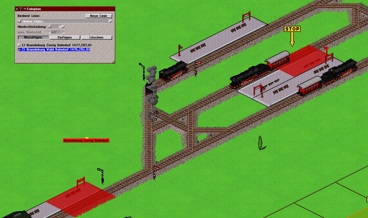 Gleiswahl-Ausschluss - Klüle - 30-06-2021 Hallo! Eigentlich dachte ich, dass man mit dem Gleiswahl-Ausschluss-Signal ein Gleis von der Gleiswahl ausschließen kann. Jedoch fährt die Lok links, deren Fahrplan geöffnet ist, wie man sieht in den oberen Bahnhof ein, obwohl sie das nicht soll. Kann mir bitte jemand erklären, was ich falsch gemacht habe bzw. wie man dieses Signal eigentlich einsetzt? Generell wäre es auch sehr schön, wenn sich ein Gleiswahlsignal nicht nur auf den nächsten Bahnhof im Fahrplan beziehen würde, sondern auch auf Wegpunkte. Es gibt z.B. viele Situationen, in denen ein Güterzug einen Passagierbahnhof ohne Halt durchfahren soll und dabei auch ein Gleiswahlsignal passiert. Befindet sich kein weiteres Gleiswahlsignal auf seiner Route, kommt es in solchen Situationen zu unangenehmen Staus. Danke für euche Hilfe! RE: Gleiswahl-Ausschluss - makie - 30-06-2021 Zitat:Eigentlich dachte ich, dass man mit dem Gleiswahl-Ausschluss-Signal ein Gleis von der Gleiswahl ausschließen kann. Ich sehe da kein Auswahl-Ende Signal sondern nur ein weiteres Auswahlsignal. Zitat:ein Güterzug einen Passagierbahnhof ohne Halt durchfahren soll und dabei auch ein Gleiswahlsignal passiert. Durchfahrende Züge sollten um Gleiswahlsignale herum geleitet werden und sie nicht passieren. Sonst passieren unerwartete Dinge. RE: Gleiswahl-Ausschluss - Klüle - 30-06-2021 (30-06-2021, Wednesday-18:34:24 )makie schrieb: Ich sehe da kein Auswahl-Ende Signal sondern nur ein weiteres Auswahlsignal. Ja, sie ähneln einander sehr, es sind aber zwei verschiedene Signale. Beim oberen Signal ist das Auswahl-Zeichen ganz fein rot durchgestrichen. (30-06-2021, Wednesday-18:34:24 )makie schrieb: Durchfahrende Züge sollten um Gleiswahlsignale herum geleitet werden und sie nicht passieren. Sonst passieren unerwartete Dinge. Genau, und das ist schade. Man könnte dem durchfahrenden Zug ansonsten einfach einen Wegpunkt direkt hinter dem Bahnhof mit in den Fahrplan setzen, zu dem er dann ein freies Gleis wählt. Dürfte technisch ja kein Akt sein. RE: Gleiswahl-Ausschluss - Andarix - 30-06-2021 (30-06-2021, Wednesday-18:11:44 )Klüle schrieb: .... Die Definition von dem Auswahlendesignal ist falsch. Das Auswahlendesignal ist kein Signal sondern schon immer ein Schild. Also ein Auswahlendesignal ist niemals animiert und wechselt folglich auch seine Grafik nicht. RE: Gleiswahl-Ausschluss - makie - 30-06-2021 Ich kenne als Auswahlende nur dieses hier in pak192.comic: https://makie.de/translator/script/edit.php?obj_id=138602&index=27 und ein paar ähnliche. Wenn das selbst gebastelt ist dann würde ich auf "end_of_choose=1" prüfen. Zitat:durchfahrenden Zug ansonsten einfach einen Wegpunkt direkt hinter dem Bahnhof mit in den Fahrplan setzen Laut Wiki: https://simutrans-germany.com/wiki/wiki/de_RailwaySignal sollte das setzen von einem Wegpunkt das Problem lösen. Siehe das 3. Bild. Getestet habe ich das selbst nicht. RE: Gleiswahl-Ausschluss - Klüle - 30-06-2021 Es ist: Simutrans 121.0 - r8870 pak192.comic.0.4.1 Ohne AddOns und sonstige Veränderungen, habe da nicht dran rumgebastelt. Hier habe ich das Auswahlmenü geöffnet und markiert, welches Signal (doch, hier ist es ein Signal) als "Gleiswahl-Ausschluss" bezeichnet wird. Das Signal verhält sich genau wie ein Blocksignal und Wegpunkte werden wie gesagt von Auswahlsignalen ignoriert. Ich denke, das ist einfach ein Bug, oder...? Ah, ich habe jetzt meine Versionen geupdated. Jetzt sieht das Menü ganz anders aus und es gibt viele neue Funktionen. Wahrscheinlich funktioniert es jetzt. Meine schöne Map, an der ich schon seit Wochen spiele, läuft aber nicht mehr