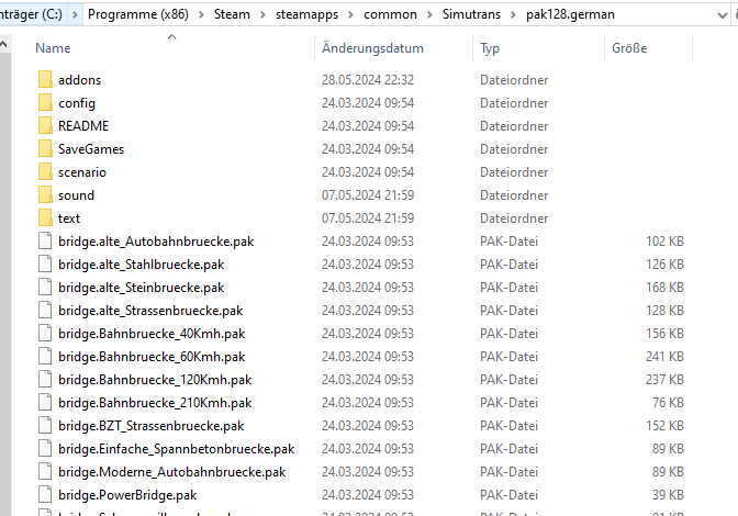 RE: Brücken für Schnellzüge (z.B. 350 km/h) / pak128.german - Leartin - 29-05-2024 Also zum einen unterstützt auch Steam Addons, zum anderen ist es ganz egal, ob ein Set in einzelnen pak-files daherkommt oder diese verschmilzt (kann man auch mit makeobj wieder aufdröseln) Wenn du schon eine fertige pak-Datei hast ist der schwierigste Teil gemeistert. Lad sie doch mal hoch, dann können wir schauen, ob alles passt. Auch bei der Suche nach den Addon-Ordnern können wir unterstützen, aber das muss ich mir selber ansehen. (Ich habe den Verdacht, dass die aktuelle Steam-Version sich gegen Änderungen der Paksets selbst sträubt, und es am einfachsten sein könnte, den Workshop zu nutzen - hab ich aber selber noch nie gemacht, daher muss ich mir das erst anschaun) RE: Brücken für Schnellzüge (z.B. 350 km/h) / pak128.german - makie - 29-05-2024 Addon Ordner: Den musst du wahrscheinlich selbst anlegen. such wo das Spiel die "save" ablegt dort muss wenn er nicht schon existiert ein "addons" Ordner angelegt werden in diesem Ordner muss ein Ordner "PAK128.german" angelegt werden (in genau der gleichen Schreibweise wie das Pak selbst) und in diesen Ordner kommen dann die neuen Brücken alternativ: kopiere deine .pak Datei zu den anderen pak Dateien ins "PAK128.german" Nachtrag: Damit es keine Probleme mit doppelten gibt ist es besser einen eigenen Namen zu vergeben. Also in die .dat bei name=Bahnbrxxxx dadurch bekommt die .pak Datei auch diesen Namen RE: Brücken für Schnellzüge (z.B. 350 km/h) / pak128.german - makie - 29-05-2024 Zitat:und sogar bei dieser sind die Ordner jetzt verschwunden Die stehen vermutlich jetzt bei den Dateien des Users. Windows "Eigene Dateien" Linux /home/Benutzernamen/simutrans oder sogar versteckt /home/Benutzernamen/.simutrans RE: Brücken für Schnellzüge (z.B. 350 km/h) / pak128.german - blume3000 - 31-05-2024 Also wie im ->Bild1 Im steam-Ordner hingegen befinden sich die paks inklusive "addons" und "savegames", doch ich habe das Gefühl das sind eher so 'tote Ordner', da dort weder meine gespeicherten Spiele angezeigt werden noch die addons im Spiel erscheinen. ->Bild2 Bei den "Eigenen Dateien" wurde ich fündig und habe dort "addons" und "save" gefunden (habe mich eh gefragt wo die savegames gespeichert sind, danke makie!). Allerdings sind dort keine pak Ordner. ->Bild3 Dort in addons\pak128.german habe ich nun die 350km/h Brücke hingelegt und das Spiel lässt sich tatsächlich mit addons starten, dort die Brücke ist leider nicht da... dann habe ich wohl doch etwas beim Erstellen falsch gemacht. Wäre wirklich toll, wenn du dir das pak mal anschauen könntest, Leartin.