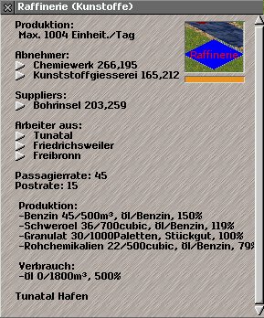 Weiter: Wenn bei einer Raffinerie 1000 irgendeines Gutes an Abnehmer vergeben sind, wird eine neue Raffinerie gebaut, auch wenn es für das produzierte z.B. Schweröl noch gar keinen Abnehmer gibt.