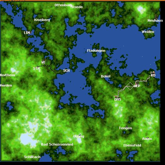 Er hat unten links bei Dasing angefangen. Da ihm damit die Konnecktion zur gröten Stadt fehlte (Linnich) hat er sie mit dem Flugzeug angebunden.