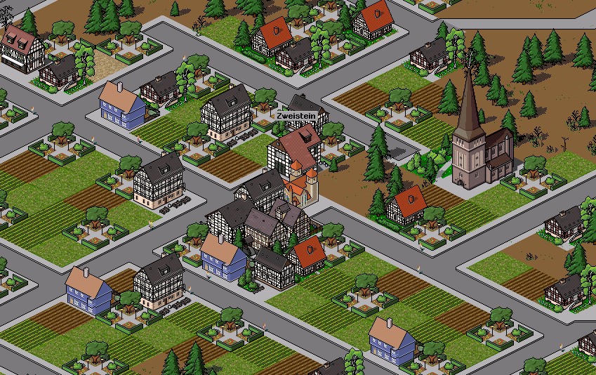Die Häuser sind alle von Alexander Brose. Der Turm, der Park und die Äcker und Wiesen von mir.