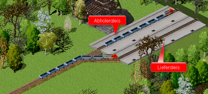 2.) Einen 2 gleisigen Bhf bauen. Ein Gleis fest als Abholergleis definieren, das andere für den Lieferzug freigeben.
