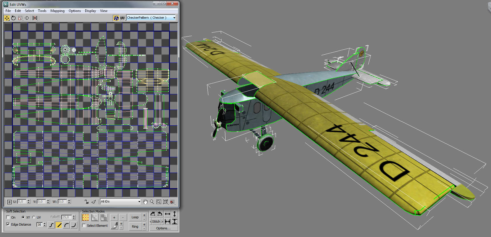 Tragflächen und Rumpf haben (vereinfacht) ein Profil am Rumpf und eines am gegenüberliegenden Ende. Die lassen sich mit bisschen Erfahrung schnell freihändig "malen". Alles, was ihr zwischen diese Profile aufwendig pixeln müsst, lässt sich im Modeller entweder quasi auf Knopfdruck durch die Verbindung der zwei Profile erzeugen oder auch mit zwei Knopfdrücken mehr gleich die komplette Tragflächenstruktur aus einem Quader "hauen" (bei mir meist Letzteres). Rest macht die Textur, incl. Glanz (letzterer wird mit einem Graustufenbild realisiert - heller im Bild, mehr Glanz auf dem Objekt).