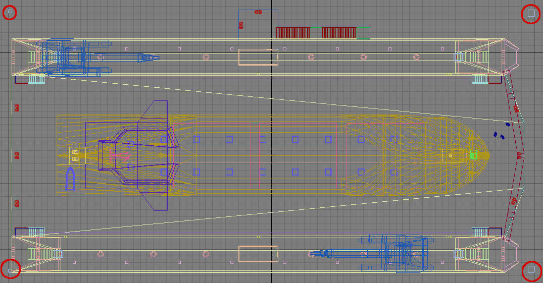 Noch mal geschaut: Das Schwimmdock ist nicht genau 4x2 Kacheln. Die Außenecken der hellblauen Schnittmarken begrenzen 80x40m, wie man sehen kann, schließt das Dock nur an zwei Seiten exakt an die gedachten Verbindungslinien der Ecken.