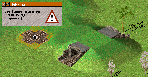 Auf dem Screenshot ist links eine Geländestufe mit halber Höhe zu sehen, der Tunnelbau funktioniert dort nicht, da das Gelände zu flach ist. Da muß das Gelände um eine wietere halbe Stufe angehoben werden. Recht ist der bereits gebaute Tunnel zu sehen.