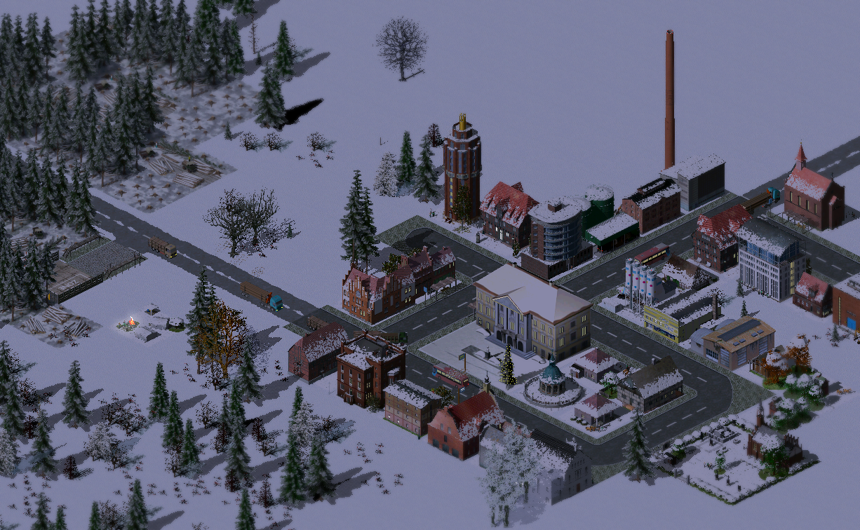 Wo jetzt der Winter allmählich seinen Abschied gibt, ist mir ein Screenshot rund um den oben genannten Screenshot contest eingefallen, den ich zu posten vergessen habe. Mein Winterbild hatte nur Material aus der Version 0.8 des PAK128.german benutzt, andere waren da lockerer. Ein kleines Schmankerl hätte unser Set auch noch gehabt, nämlich das Lagerfeuer, um das sich in diesem Bild die Waldarbeiter versammelt haben.