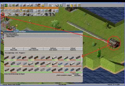 Du baust ersteinmal eine Schiene, auf diese setzt du am Ende ein Bahndepot. Wenn du darauf mit dem Auswahlwerkzeug klickst, kannst du die Züge zusammenstellen.