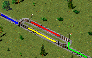 Aber das worauf es hier ankommt, ist die Tatsache, dass ein Zug nur nach vorne reserviert (bis zum nächsten Wegpunkt oder Signal) aber hinter sich die Strecke, nach dem befahren, Kachel für Kachel sofort wieder freigibt. Das heisst sobald das Zugende komplett in die Doppelgleissektion eingefahren ist, ist die Strecke dahinter - also auch das komplette Einzelgleis sowie die Kreuzung wieder freigegeben - d.h. der Zug in Gegenrichtung kann nun durch, auch ohne ein Signal im Einfahrtsbereich der Doppelstelle.