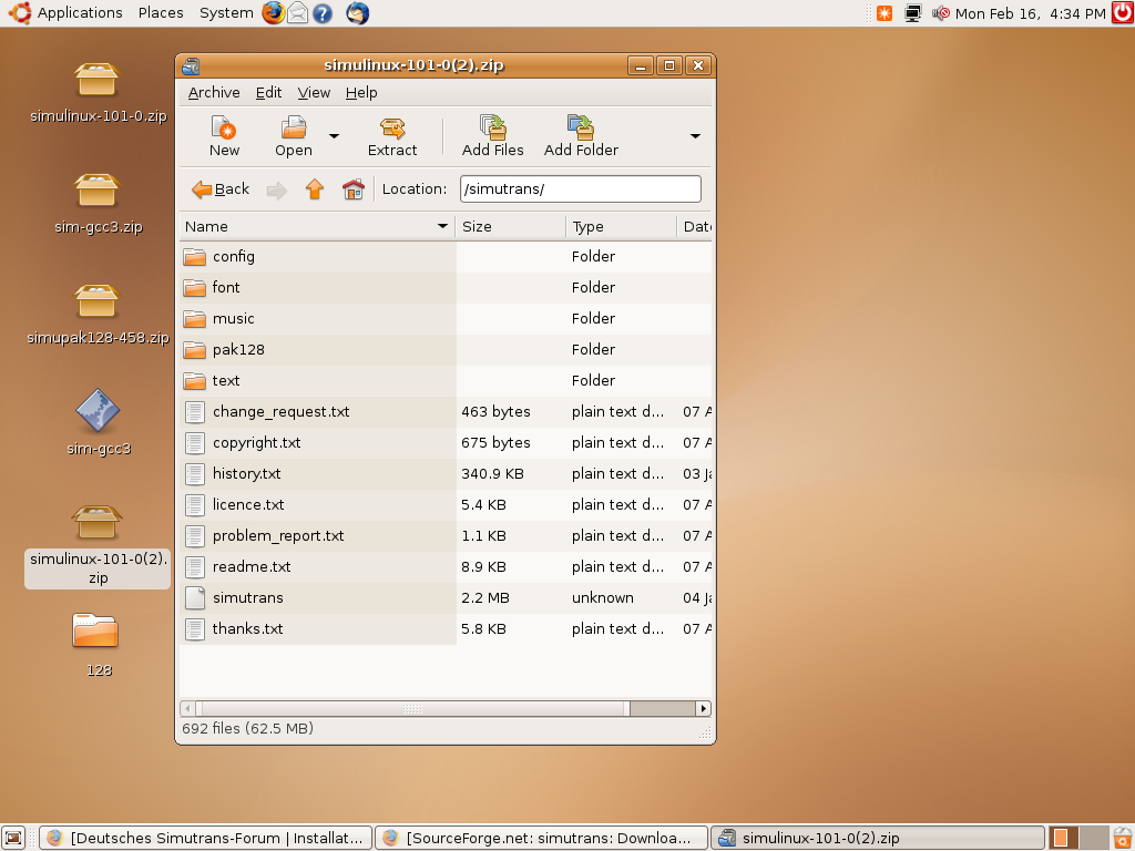 Ich hab mir jetzt in meiner VM mit Ubuntu 7.04 von sourceforge simulinux-101-0.zip runtergeladen und extrahiert. dann hab ich mir ein pak128-nighty geholt und das hab ich dann wie bei windows/os x/etc. in den simutrans-ordner kopiert. soweit so gut. aber ich hab schon mal keine .exe/.dmg/etc. (wie heisst das bei ubuntu) gefunden, nur eine Datei ''unknown type''. und als ich dann versucht hab die zu öffnen, sollte ich eine anwendung auswählen mit der ich simutrans öffnen wollte. ist das gar nicht die programmdatei oder was? s.bild.