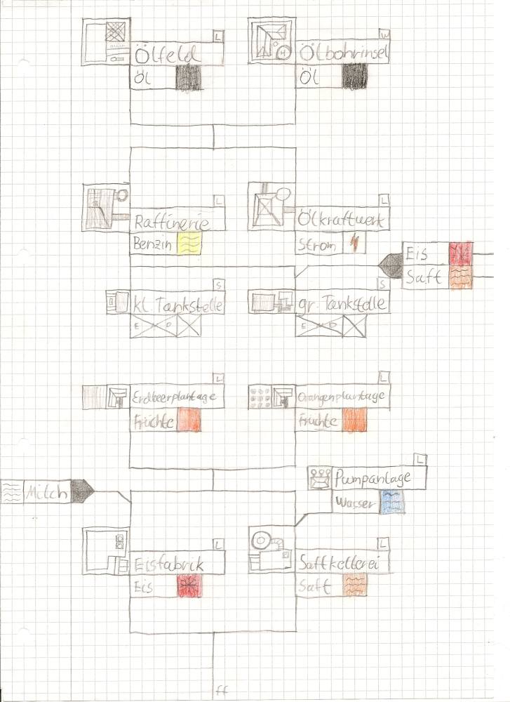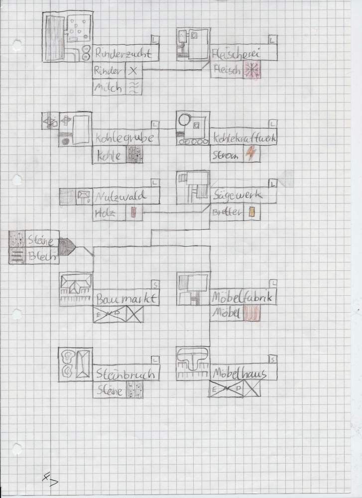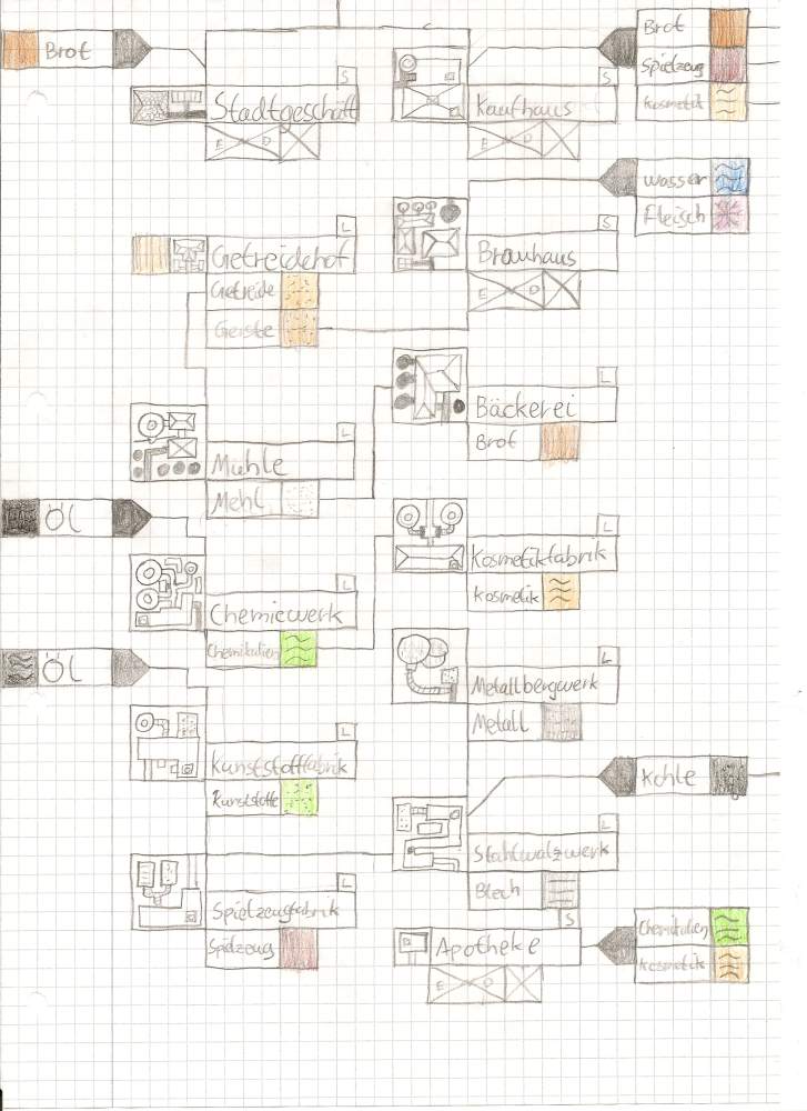 Anbei ein Plan für die Industrien (langfristig), die Grafiken eines Hochhauses, einer kleinen Kirche, einer Stadtstraße sowie einiger Gleise und Flüsse in eine Richtung.