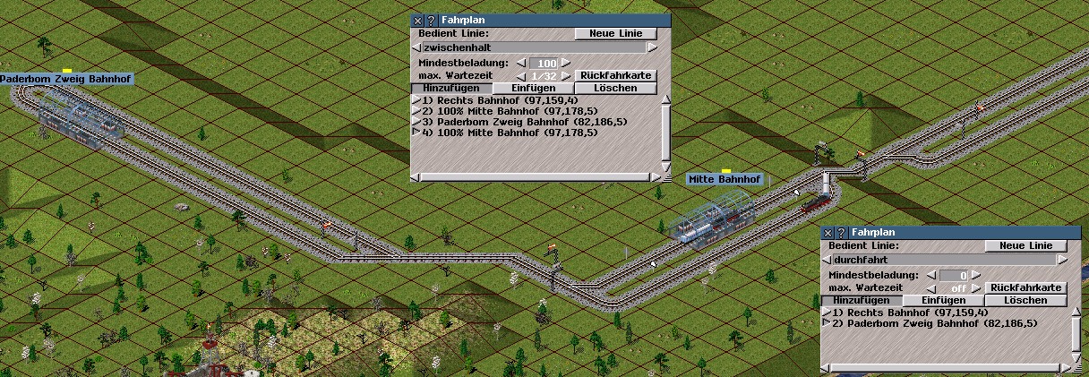 Das ganze funktioniert natürlich nur, wenn auf der Folgestrecke jeweils Platz für beide Züge ist. Die Lösung kann z.B. eine Doppelspur für Hin- und Rückfahrt sein, wie im Bild. Da gibt's aber auf jeden Fall eine Vielzahl von eleganteren Möglichkeiten