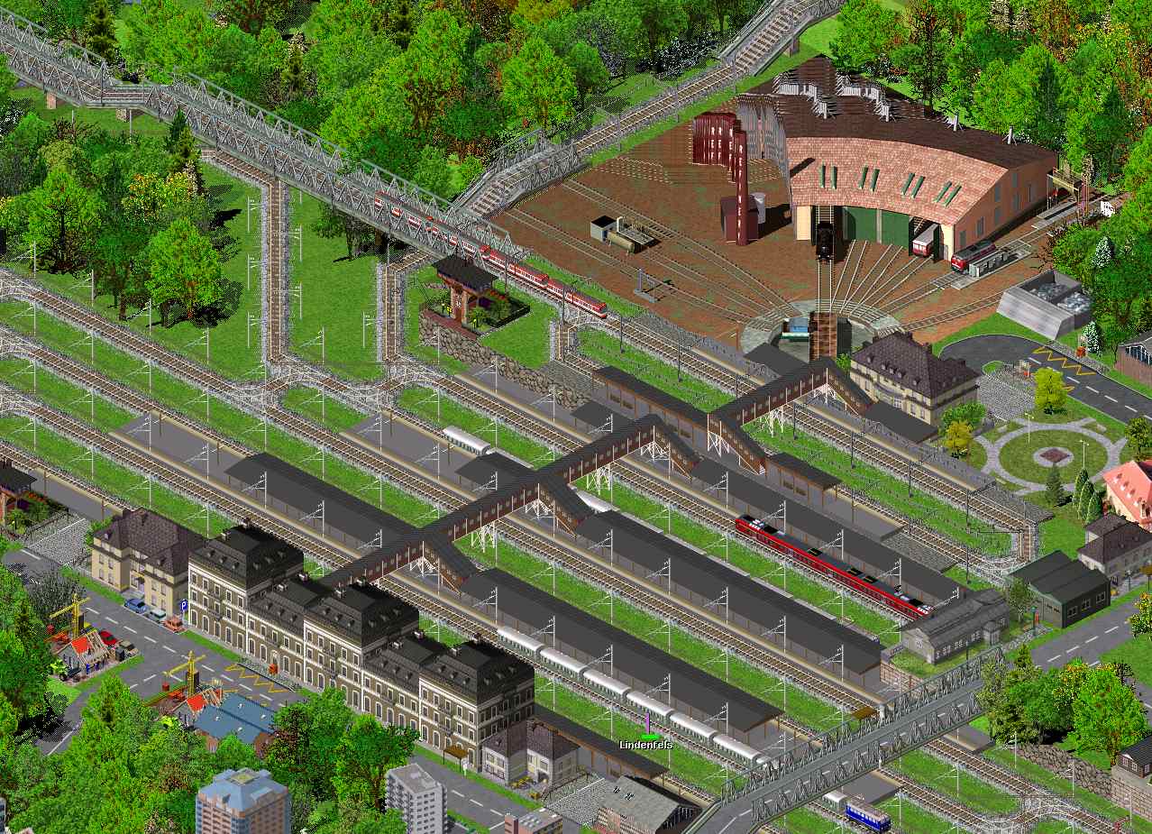 Sehr schön macht sich hier auch das große Bahnhofsgebäude aus dem pak128, auch wenn es der ganzen Szene eher eine etwas französische Optik verleiht.