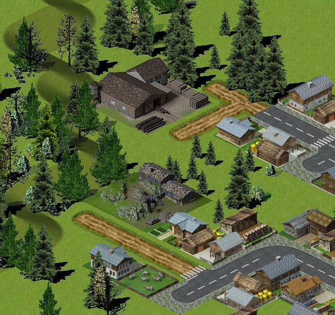 Auf dem ersten Screenshot befinden wir uns in den Alpen, wo ein uralter Steinbruch seine letzten Dienste tut. Dahinter hat sich der Säge-Meier in Position gebracht, bei ihm geht es schon zeitgemäß zu.