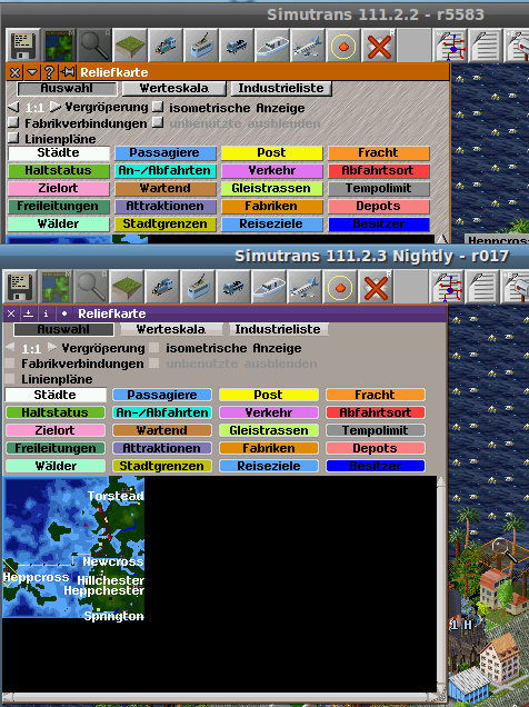 Wenn man im Eistellungsmenu eine Schaltfläche betätigt, einen Dialog öffnet und wieder schließt, bleibt die entsprechende Schaltfläche danach noch hell unterlegt (ist im Standardsimutrans auch so, ist mir aber vorher nie aufgefallen, nur hier, vielleicht wegen des Themas oder der Ausrichtung untereinander mit den Trennstrichen) - nicht schlimm, fällt aber irgendwie mehr auf (Anhang 2).