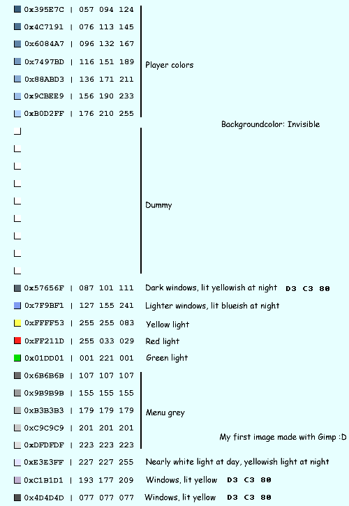Die Transparenten stellen, an denen die Landschaft dahinter durchscheinen soll, müssen einen bestimmten blau-ton haben, nämlich 231; 255; 255 (RGB). Ausserdem gibts noch weitere spezielle Farben, die nachts leuchten bzw nachts einfach nicht dunkler werden. Ich häng dir hier die Palette an, dann weisst du bescheid.