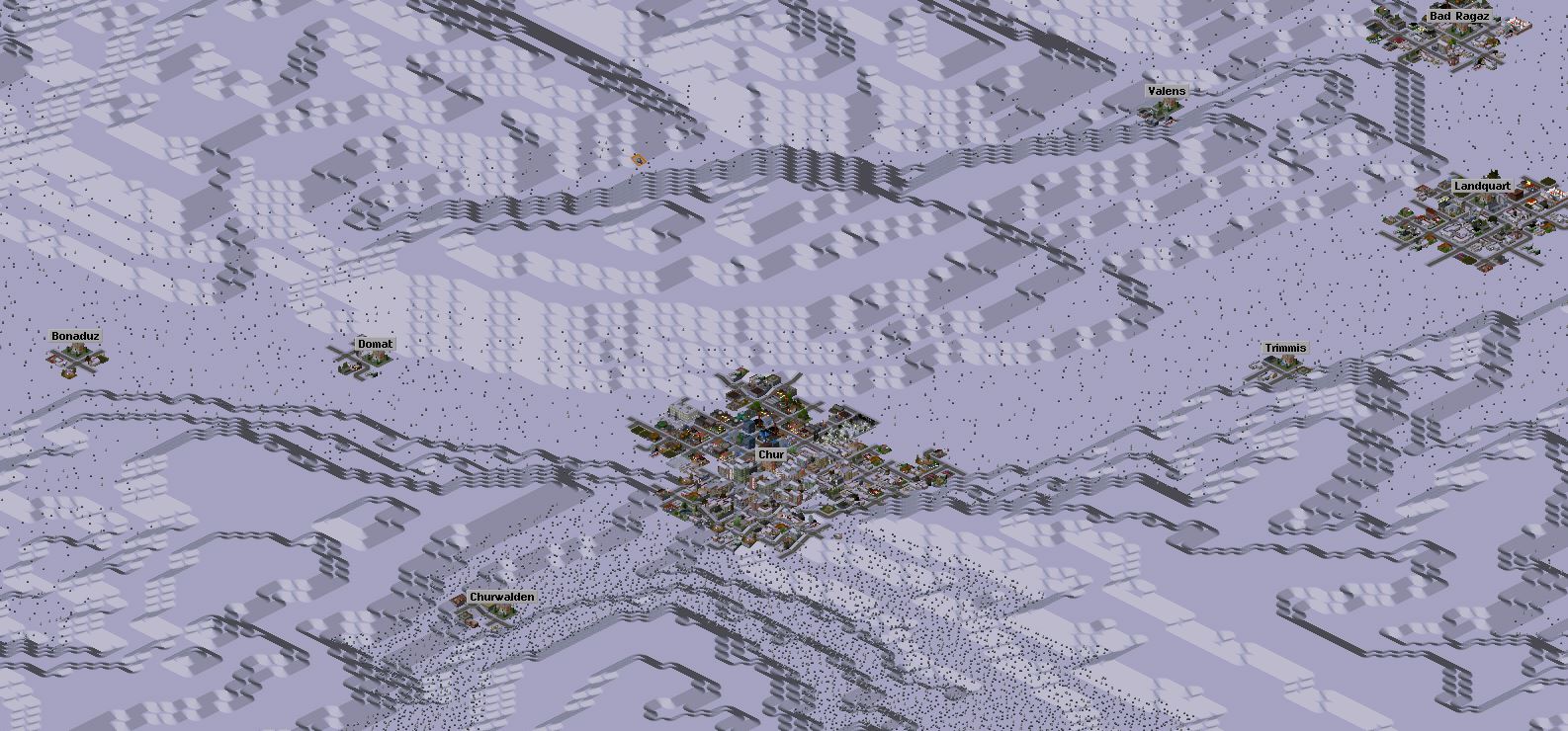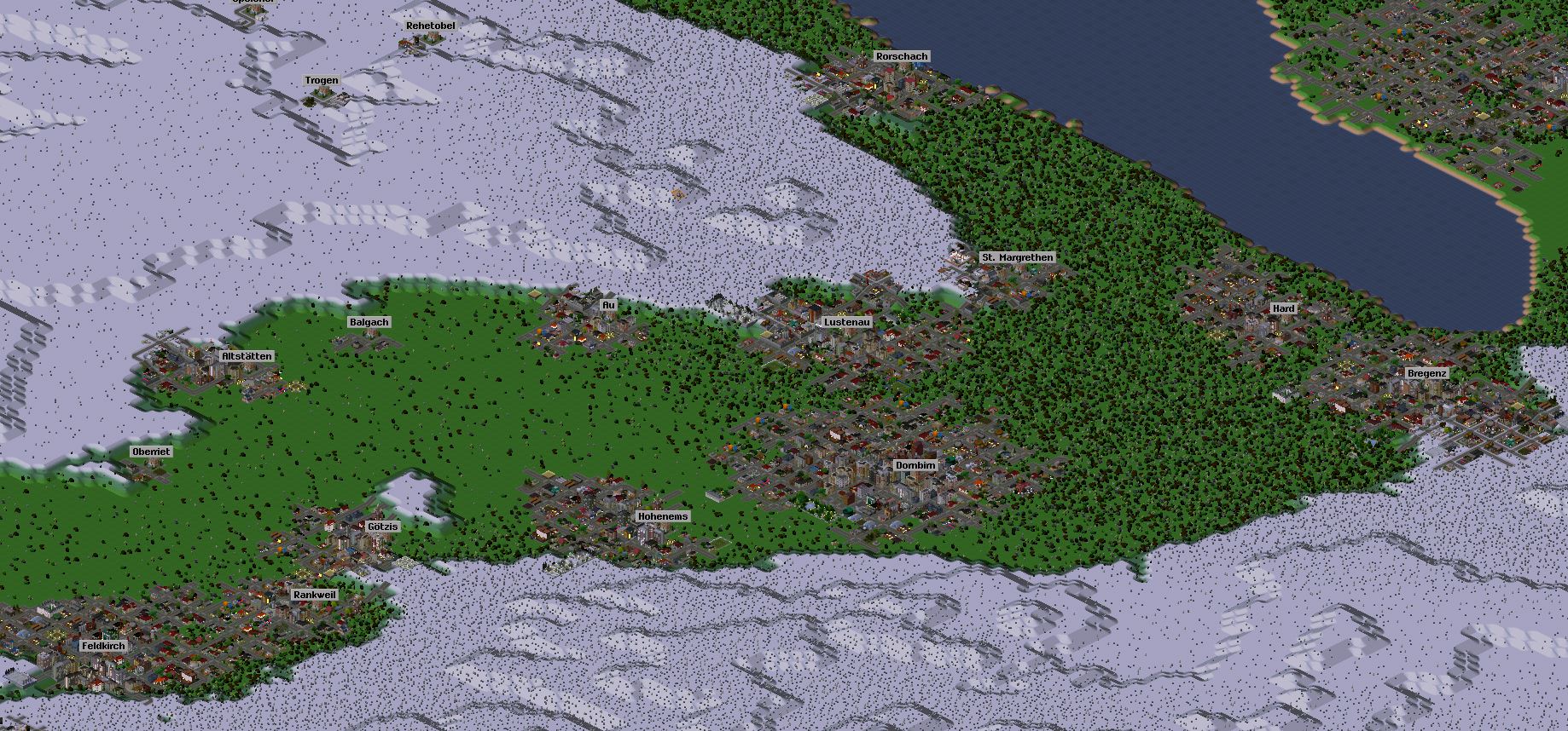 Auch das Rheintal - die österreichisch-schweizerische Grenze - ist sehr dicht bevölkert. Rechte Talseite Österreich, linke Schweiz... übrigens ein paar Felder rechts neben Rorschach am Bodensee-Ufer steht in der Wirklichkeit ein Stadler-Werk