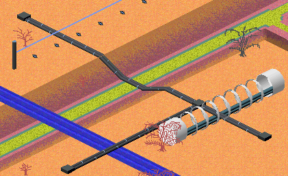In Simutrans sind Stromleitungen als Oberleitungen konzipiert, und deshalb können sie Verkehrswege oder Flüsse kreuzen, ohne daß man eine Brücke oder eine Kreuzung dafür braucht, die Fahrzeuge fahren einfach drunter durch. Bei mir ist die Stromleitung jedoch ein Kabel, das auf dem Boden liegt, und da sieht das natürlich blöd aus (Anhang 1).