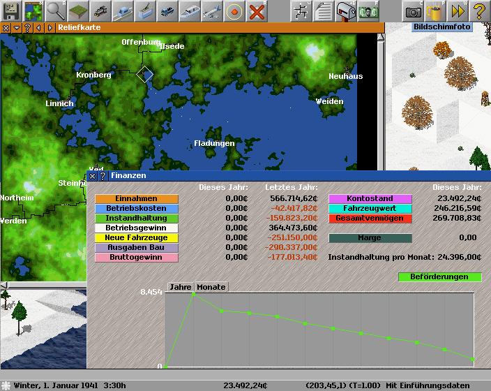 Ein Spiel von catefan: Auch dieses ist ein Fliegerspiel. Linnich (1) Dasing (2) Schramberg (3) sind verbunden. Innerhalb der Städte gibt es Buslinien. Es wurde von Linnich angefangen die Fluglinien in die "unteren" Städte ausgebaut. Zuerst die Buslinien, damit sich die Flugzeuge rentieren, dann diese Hinterher. Ich selber muß zugeben, das ich folgendes anders gemacht hätte: 1. billigere Landebahnen (Unbefestigt statt modern) 2. Kürzere Startbahnen (3 Felder reichen) Aber da das Spiel gewinn bringt, will ich nicht meckern ;o) Hinweis für die Leute, welche Probleme mit dem Spiel haben. Laut eigenen Angabren hat auch catfan 3 Anleufe gebraucht. Ansonsten nettes Spiel. In der Zukunft müssen mehr Attraktionen und Städte angebunden werden, vorallem die Städte dürften wegen der Fluglinien keine Probleme bereiten. Eher die zu erwartenen Massen dürfte wegen des Spielalters (1941) und den daraus resultierenden kleinen Flugzeugen demnächst Probleme machen. Simutrans 88.10.1 unter Linux P.S. Da mann Fluglinien schlecht im Sceenshot sieht, habe ich ihn mir gespart.
