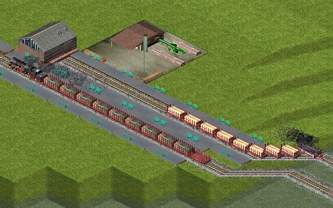 4) Eine BR78 mit Brettern erreicht das Möbelwerk, während eine BR50 mit Kabinentender mit gedeckten Güterwagen mit Möbeln auf die Ausfahrt wartet.