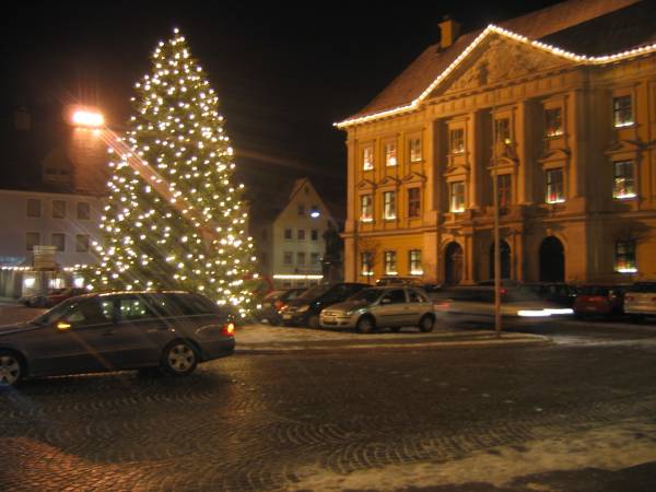 Das Lauinger Rathaus hat auch eine Winteransicht spendiert bekommen. Um die Weihnachtszeit steht in der einen Ecke des Marktplatzes ein großer Weihnachtsbaum.