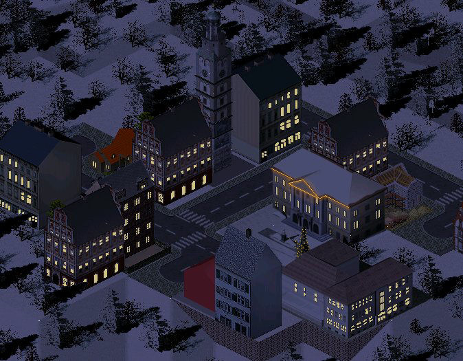 Leuchtet der Giebel des Rathauses mutwillig? Wenn es Weihnachtsbeleuchtung ist, könnte man das ja auch so gestrichelt machen, quasi so, dass man die einzelnen Birnen sieht.