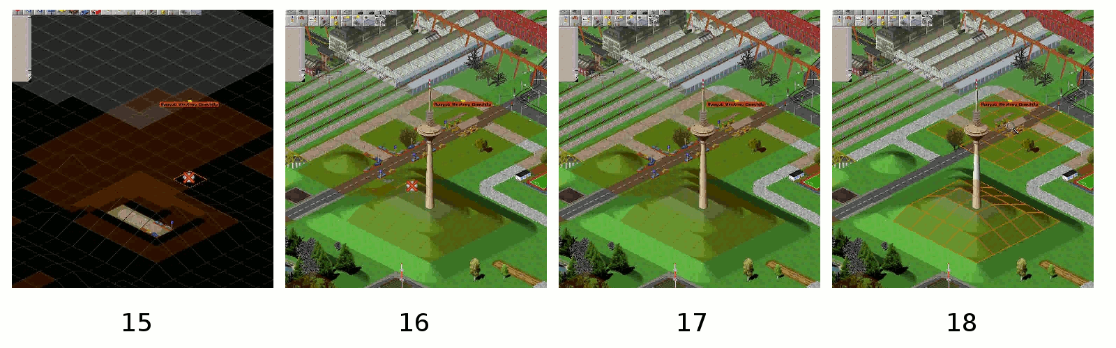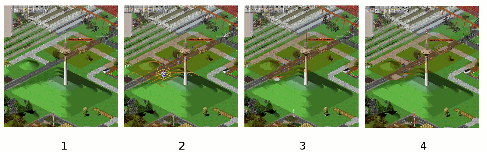 Wir wechseln zurück in den Untergrund-Modus (Bild 10) und bauen Parkplätze ausgehend vom ersten Stück neben der Einfahrt des Tunnels bis zum Stück unterhalb des Fernsehturmes (Bild 11).