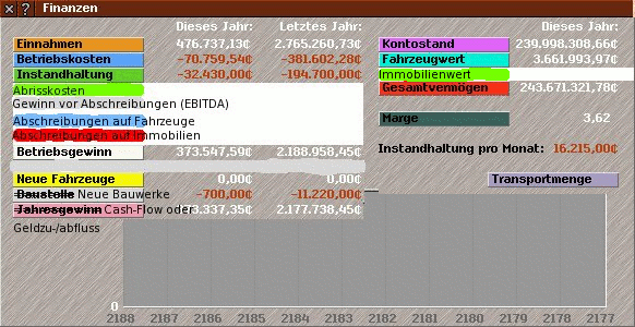 Ausserdem sind Abschreibungen eine Frage der Nutzungsdauer, da diese bei Simutrans nicht begrenzt ist, darf man auch nichts abschreiben.
