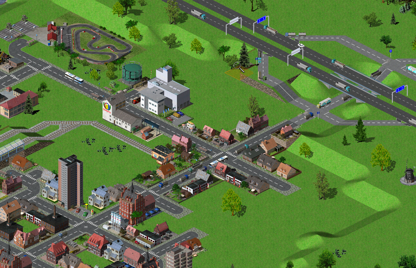 Landstraße - gut und schön, aber ein neues Industrieviertel wird für einen Autobahnanschluss dankbar sein. Möchtegern-Rennfahrer können auf der Skartbahn links oben schon mal für den Autobahn-Ernstfall üben ...