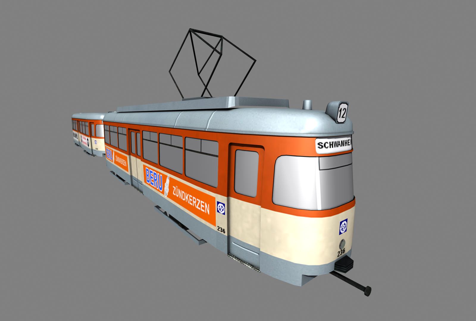 Passende Oberleitung für 70km/h gibt´s im Strabamenü noch nicht, aber die von der Bahn lassen sich ja nutzen. Gear-Wert ist so eingestellt, dass max. zwei voll beladene Beiwagen mit Höchstgeschwindigkeit gezogen werden können.