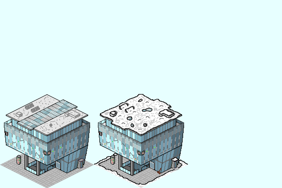 Gehen wir also direkt zum "Wie" über. Das wichtigste zuerst - Kantenglättung. Beim setzen deiner Konturen hast du nicht bloß schwarze Pixel erzeugt, sondern auch 'grau', bzw. halbtransparentes Schwarz, welches sich mit dem hellblauen Hintergrund vermischt hat. Das ist der Grund, warum dein Gebäude in der früheren Version im Spiel eine bläuliche Aura hatte - das dürftest du ja gemerkt haben, denn diese Außenpixel hast gesäubert. Geblieben ist jedoch, dass viele deiner Konturen kein echtes Schwarz sind, also #000000. Sieht man sehr schön, wenn man schwarz durch allseits beliebtes quietschpink ersetzt: Eigentlich sollte in so einem Fall auch wirklich alles an Konturen erfasst sein. Ein Beispiel, wie es aussehen sollte: Das ist üblicherweise auf die Werkzeugeinstellungen zurückzuführen. Ich habe GIMP nicht installiert - aber suche bei dem Werkzeug, das du für die Linien verwendet hast, nach einem Eintrag "Weiche Kanten", "Kantenglättung" oder "Anti-Aliasing" und deaktiviere es. Dann werden keine Mischfarben mehr erzeugt, sondern nur noch verwendet, was in der Farbpalette ist. Dadurch kann auch zB. das Füllwerkzeug sinnvoller angewendet werden. Kantenglättung beim Pixeln gibt es aber auch - nur wird diese zumeist manuell gemacht. Eine Farbfläche, welche von einer diagonalen Kontur abgeschlossen wird, sollte stehts eine dunklere Version der Farbe direkt an den Kanten genutzt werden. Zugegeben - da bin ich selber etwas muffelig, diese Glättung immer anzuwenden. Dafür ist Alex um so tüchtiger - Betrachte die Übergänge zwischen Konturen und den Flächen, direkt an den Konturen sind dunklere Pixel. Das Resultat davon ist, dass die Konturen glatter und etwas fester wirken. Ich mache das inzwischen übrigens so, dass ich ziemlich ohne Kantenglättung arbeite und als einen der letzten Arbeitsschritte 50% transparentes Schwarz in einer neuen Ebene nutze, um die ganzen Kanten nochmal nachzuzeichnen. Damit dauert es nicht allzulange. (Ja, dieses Beispiel nutzt transparenten Hintergrund. Ist recht neu, dass das möglich ist - somit kann auch die Außenkante geglättet werden.) Es ist auch zu beachten, dass die Konturen nur einen Pixel breit sind. Das gilt auch für diagonale Linien - bei diesen sollten Pixel auch wirklich nur diagonal verbunden sein, und keinen Treppeneffekt erzeugen. Nutzt man ein Linien-Werkzeug (zB. auch den Stift mit... Strg-Click? Shift-Click? Ich weiß nicht mehr, wie der Stift in Gimp automatisch Linien zieht) so erzeugen die meisten Programme bereits das richtige Ergebnis. Beim Freihandzeichnen hingegen sind Pixel generell immer an den Seitenflächen verbunden, und müssten entsprechend nachkorrigiert werden. Das erklärt, warum dein Schnee so extrem breite Konturen hat - der wurde natürlich frei Hand gezeichnet und nichts nachgebessert. Eine ausführlichere Erklärung zum Thema Outline findet sich zB. hier: http://samkeddy.com/pixel-art-outlines/ Natürlich kommts auch drauf an, WO die Outlines angebracht werden. Ein sehr schweres Thema, da bin ich selbst noch oft überfragt. Aber von deinem Foto ausgehend, würde ich wahrscheinlich versuchen auch die Seiten mit Konturen für die weiß-grauen Unterteilungen zu versehen. Das würde vermutlich dazu führen, dass ich die weiß-graue Unterteilung selbst nur einen Pixel breit hätte, und statt 11 Fassadenteile nur 10 Platz fänden, wobei auch noch die Gesamtbreite des Gebäudes geändert werden müsste, damit alles gleichmäßig ist. Ein riesen Haufen Arbeit - ich kann nicht mal zuversichtlich sagen, dass es sich auszahlen würde. Nur, dass ich es machen würde, wäre es mein Gebäude. Weniger wichtig, aber es fällt eben auf, ist die Flächenfüllung. Am Dach, egal ob beschneit oder nicht, wurde versucht, eintönige Flächen zu vermeiden - was generell ganz gut ist. Verwendet wurden dazu jedoch ein paar handgezeichnete Linien - und das geht besser. Insbesondere sollte man sich immer in Erinnerung rufen, dass man flächig arbeiten kann und nicht auf Linien angewiesen ist. Erneut kommt da Alex' Hochhaus gelegen - die Dachfläche besteht nur aus drei leicht unterschiedlichen Farbtönen, welche flächig aufgetragen sind - mit dem dunkelsten außen (Anti-Aliasing nicht mit eingerechnet, sonst wären es fünf Farbtöne). Um sowas nachzupixeln, einfach das gesamte Dach mit der dunkelsten Farbe füllen, dann eine hellere nehmen und deren Außengrenze ziehen und die Mitte füllen. Dann nochmal etwas weiter innen mit der hellsten Farbe. Davon abgesehen können auch sehr regelmäßige Muster helfen, die Monotonie einer einfarbigen Fläche zu durchbrechen, wie an den Wänden von Alex' Hochhaus zu sehen. Ich habe mir da quasi schon eine Füllmusterbibliothek zugelegt. Ich denke, damit habe ich erstmal genug Input gegeben, und ich erwarte auch nicht, dass das alles an diesem Objekt nochmal geändert wird. Sinnvoller ist es da, gleich mit dem nächsten weiterzumachen, besser zu werden, und irgendwann später zurückzukehren, wenn man selbst nicht mehr zufrieden ist. Über mehrere Iterationen können sich Gebäude drastisch verbessern (dieses war Original nicht von mir, ich hatte schonmal versucht, es etwas zu verbessern, und vor kurzem dann nochmal aktualisiert):