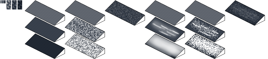 Ganz links sieht man die gepixelten Muster und die Vergrößerung derselben. Diese wurden eben auch im Programm als Muster definiert, und damit die Dachschräge gefüllt (aber Achtung, dass die Füllung immer gleich ist). Die Dachschrägen in verschiedenen Farben sollten sich in verschiedenen Ebenen befinden, welche auf den Modus "Sprenkeln" (Photoshop) bzw. "Vernichten" (Gimp) gesetzt werden. Dann kann die Deckkraft der dunkleren Ebenen runtergesetzt werden - das Ergebnis davon sieht man in der Mitte des Beispiels, auch, wies übereinandergelegt aussieht (in dem Fall 66% und 33% Deckkraft).
