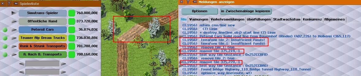 (25-09-2020, Friday-10:49:12 )Dwachs2 schrieb: Geht set_slope nicht? Welcher Befehl wird nicht ausgefuehrt? ... Das Slope setzen wird mit der Meldung Insufficient funds! nicht ausgeführt. Zitat:...Wenn dann werden die Kosten gegen das Gesamtvermoegen getestet. Das ist nicht so. Geländebauwerkzeuge funktionieren nur bei ausreichend positiven Kontostand. Was schon länger so ist. Ich nahm an das das so gewollt ist. Andere Fehlermeldungen kommen in deutsch, die wird aber in englisch an das Script zurückgegeben. Ist jetzt nicht das Problem. Nur das eben die Kosten laut Tooltip 7.500 betragen ( pak64.german ) und das ausführen bei einem Kontostand von +10.000 verweigert wird. Getestet per Maus als Spieler.