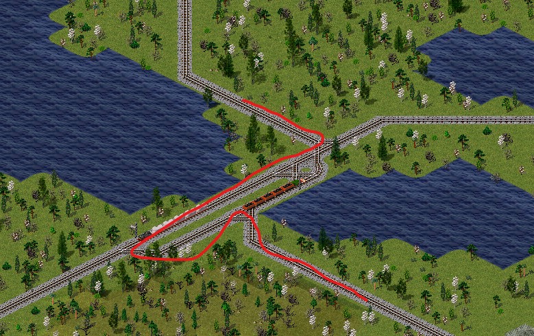 Dann wurde die rot markierte kreuzend dazu gebaut. Unglücklicher weise mittig an der Ausweichstelle angeschlossen. Und da es bis zum Bahnhof keine weitere Ausweichstelle gibt, steht dort ein leerer Kohlezug und der in der Ausweichstelle kann nicht weiter.