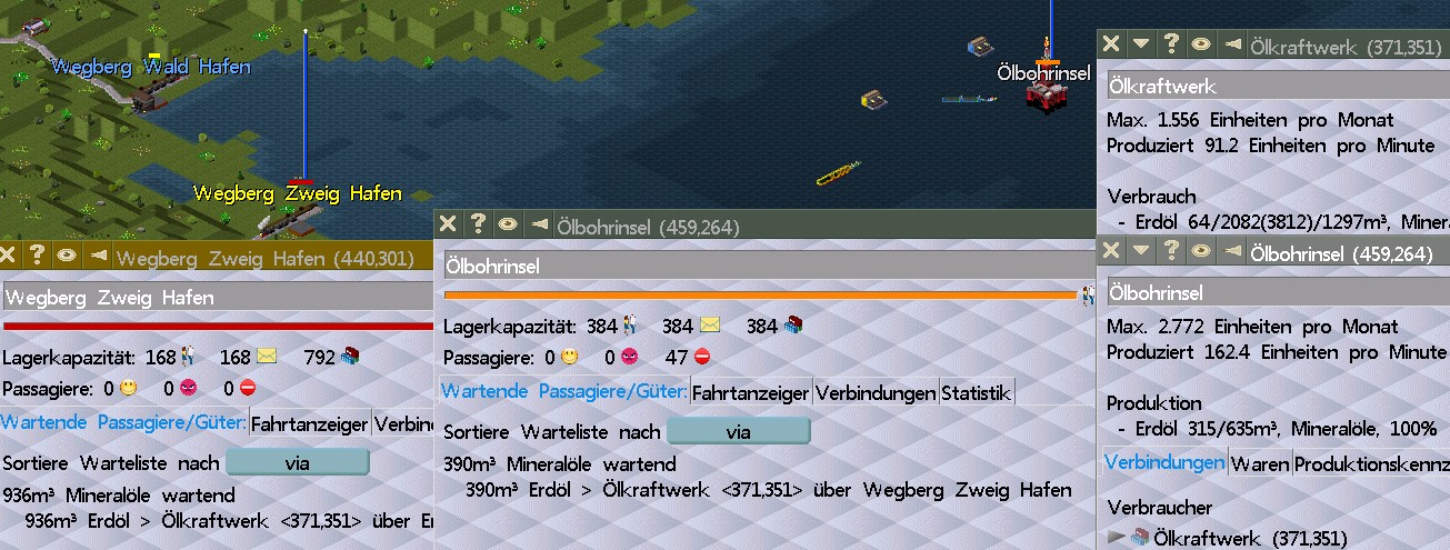 Das seltsame ist, das nur noch eine Linie (gelb, die später gebaute) bedient wird. Wird da der Hafen überfüllt, wird die Abgabe von der Bohrinsel zur Bohrinselstation eingestellt. Selbst dann, wenn die Bohrinselstation noch freie Kapazität hat und die für die andere Linie nutzen könnte.