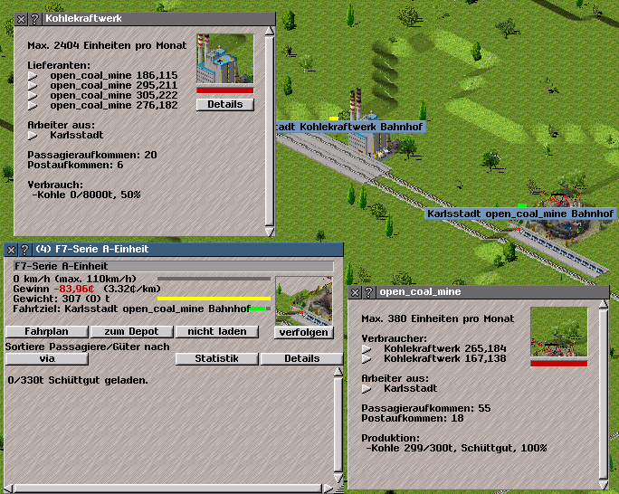 Im Anhang habe ich einen Screenshot von der Verbindung zwischen Kohlekraftwerk und Kohlegrube mit je 2 Bahnhöfen die 6 Tiles lang sind. Die Strecke wird von einem Zug mit 12 (also genau passend) Waggons (inkl. Lok) befahren. An der Kohlegrube habe ich warten auf 100% eingestellt, aber der Zug nimmt keine Kohle auf. Ich habe keine Ahnung woran es liegt - die richtige Grube zum Kraftwerk ist es.