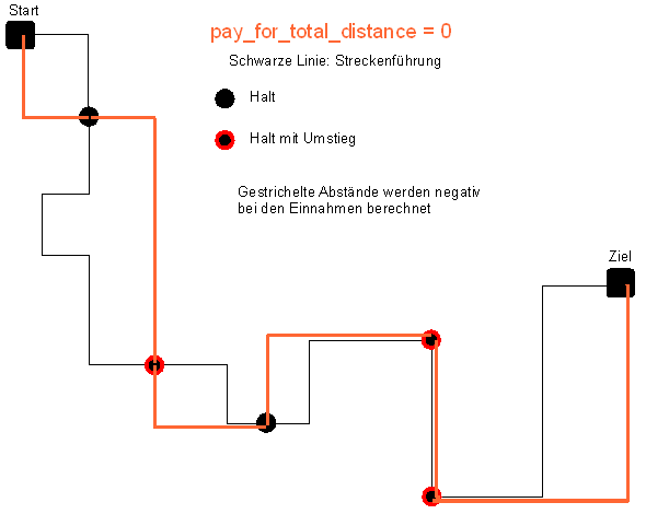 Im Fall = 0 bekommt man an jedem Halt des Zuges die gefahrene Strecke vom letzten Halt bezahlt. Das heisst insbesondere, dass man fuer Umwege den vollen Preis bekommt.