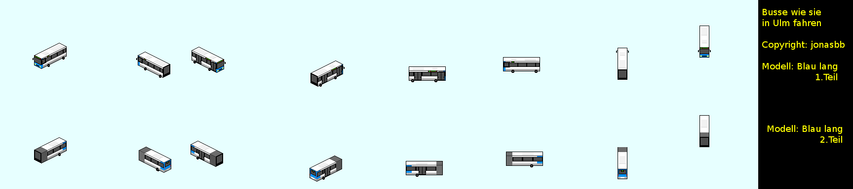 Sehen gut aus, beim hinterengelnkteil wirst du dich jedoch mit der Ausrcihtung etwas hermuspielen müssen, da die Busvorlage nicht pixelgenau die Länge 8 wiedergibt. (Es fehlen glaub ich 3-4 pixel, musst es dir dann halt im Spiel ansehen und die Ausrichtung des Hinteren Teils etwas nachbessern.)