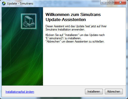 Wichtig beim Ersten Start des Update Asistenten: Beim ersten Start das Installiationsverzeichnis prüfen. (Muss auf das Verzeichnis zeigen, in dem sich das Simutrans Executable befindet.)