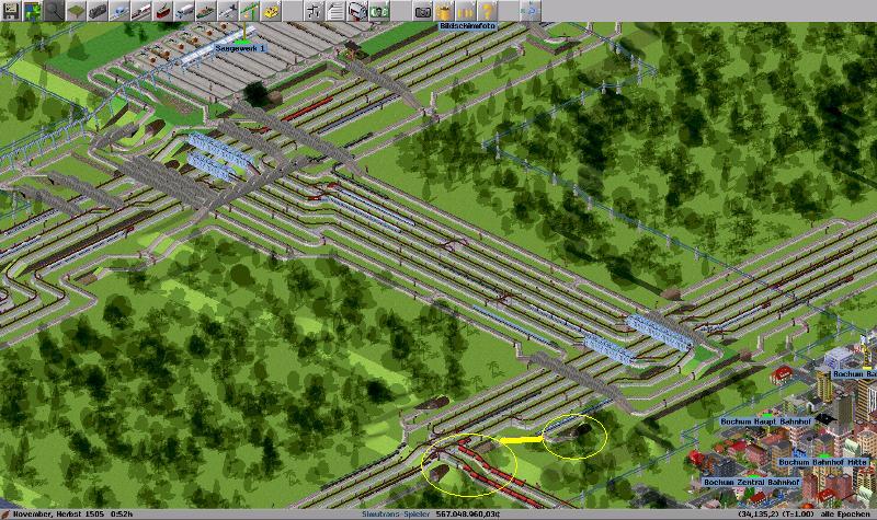 Und um jetzt mal konkret auf einen Fall einzugehen habe ich mal im Anhang markiert (gelb), welcher Streckenteil für ne optimalere Geschwindigkeit bearbeitet werden müsste. Der Zug fährt in den Tunnel => danach hoch => eine Abzweigung => danach wieder runter. Mein Vorschlag: mach doch den Abzweig einfach unter der Erde, denn somit sparen sich die Züge, welche weiter im Tunnel fahren, eine Steigung und brauchen ihre Geschwindigkeit nicht herabsetzen.