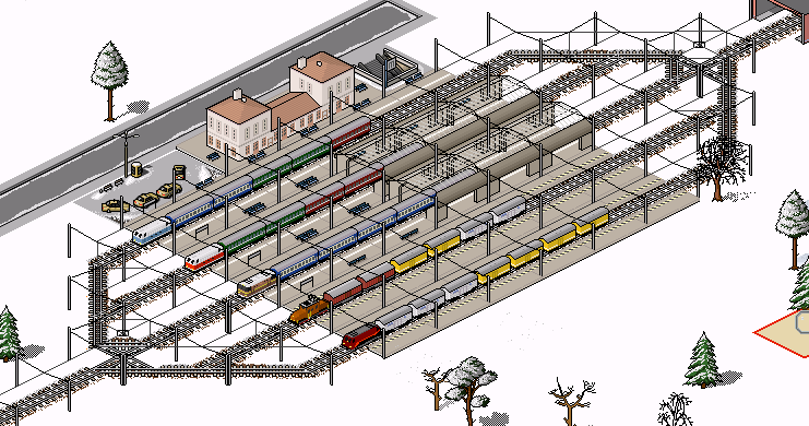 Eine Zugparade in einem verschneiten Bahnhof, dem man ansieht, dass er soviel Gäste sonst nicht hat. (Ich weiß, dass die Szenerie gestellt ist, aber trotzdem kann man sich schön dahineinversetzen.)