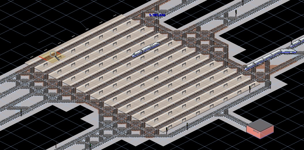 Sieht bei mir dann so aus wie auf dem folgenden Bild. Natürlich ist das auch nicht unbedingt superrealistisch, sieht alles viel zu sortiert aus. Aber ich denke, viel bessere Möglichkeiten gibt es bei Simutrans nicht. Und zumindest von der Struktur her sehen die Bahnhöfe im RL ja oft genauso aus - zwei durchgängige Hauptgleise und davon abzweigende Gleise mit noch ein paar Bahnsteigen.