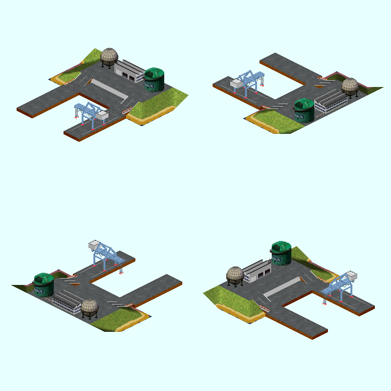 Hmm, es scheint, als ob die unteren Grafiken Spiegelungen der oberen wären, denn der Kran steht einmal links und einmal rechts! Auch die Seitenwand der "Rampe" ist einmal rot und einmal grau. Ansonsten aber ein toller Hafen! Smile
