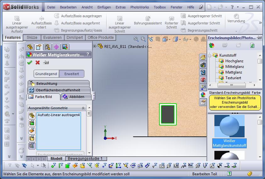 Der Grundkörper des Häusls ist jetzt natürlich farblich noch etwas unansehnlich, deshalb ist der nächste Schritt die Farbgebung. An dieser Stelle beschränke ich mich zunächst auf die vordefinierten Texturen und Farben, die mit SWX mitgeliefert werden. Damit kann man schon einiges an farblicher Gestaltung realisieren, ohne ganz tief in die Texturenmaterie eindringen zu müssen.