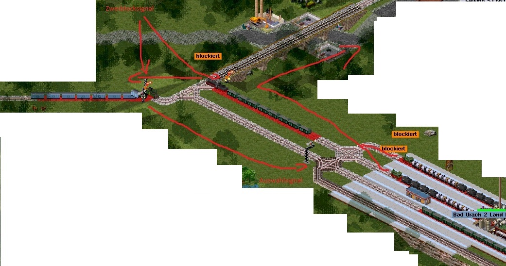Der Zug links möchte in den Bahnhof, der in der Mitte möchte auf die Strecke auf der der Zug links gerade steht. Scheinbar blockieren sie sich gegenseitig, obwohl es zweigleisig ist. Beide stehen vor einem Zweiblocksignal. Vor dem Bahnhof befindet sich ein Auswahlsignal.
