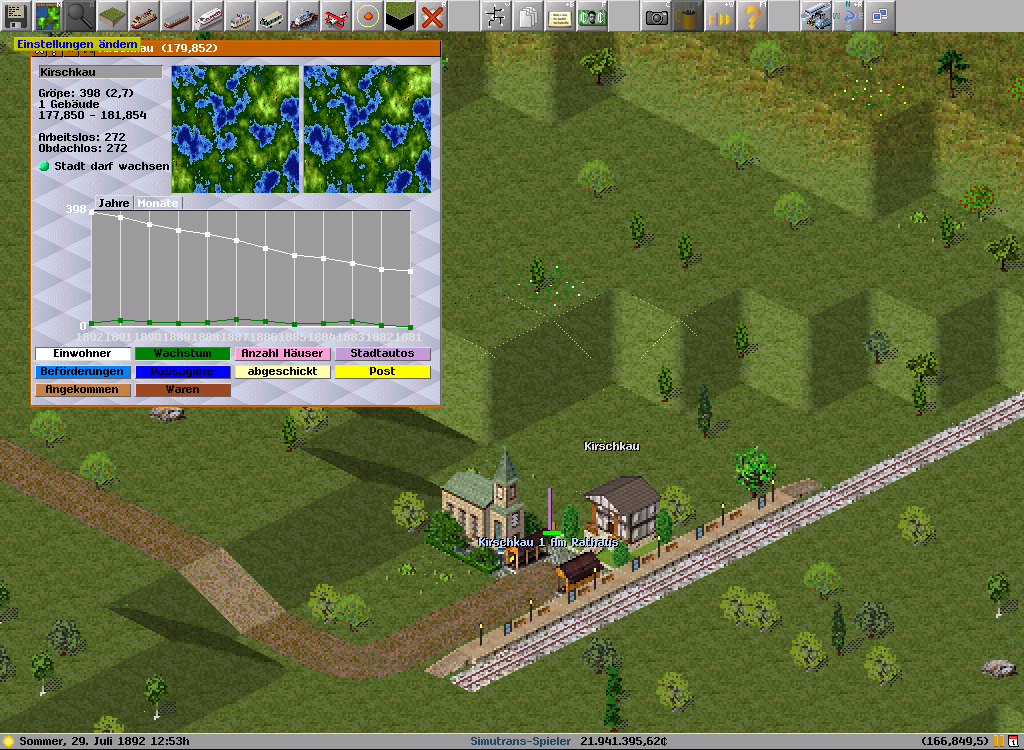 Die Stadt hat eine Grundfläche von 5x5 Kacheln, das Rathaus steht in der Mitte davon, also 2 Kacheln in jede Richtung um das Rathaus. Im jetzigen Zustand wird fast die Hälfte vom der Stadtfläche vom Bahnhof blockiert. Da der Bahnhof bzw. die Gleise über die Stadtgrenze hinaus laufen, kann die Stadt auch nicht außen herum bauen.
