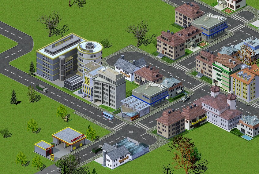 Sehr schön macht sich hier auch das große Bahnhofsgebäude aus dem pak128, auch wenn es der ganzen Szene eher eine etwas französische Optik verleiht.