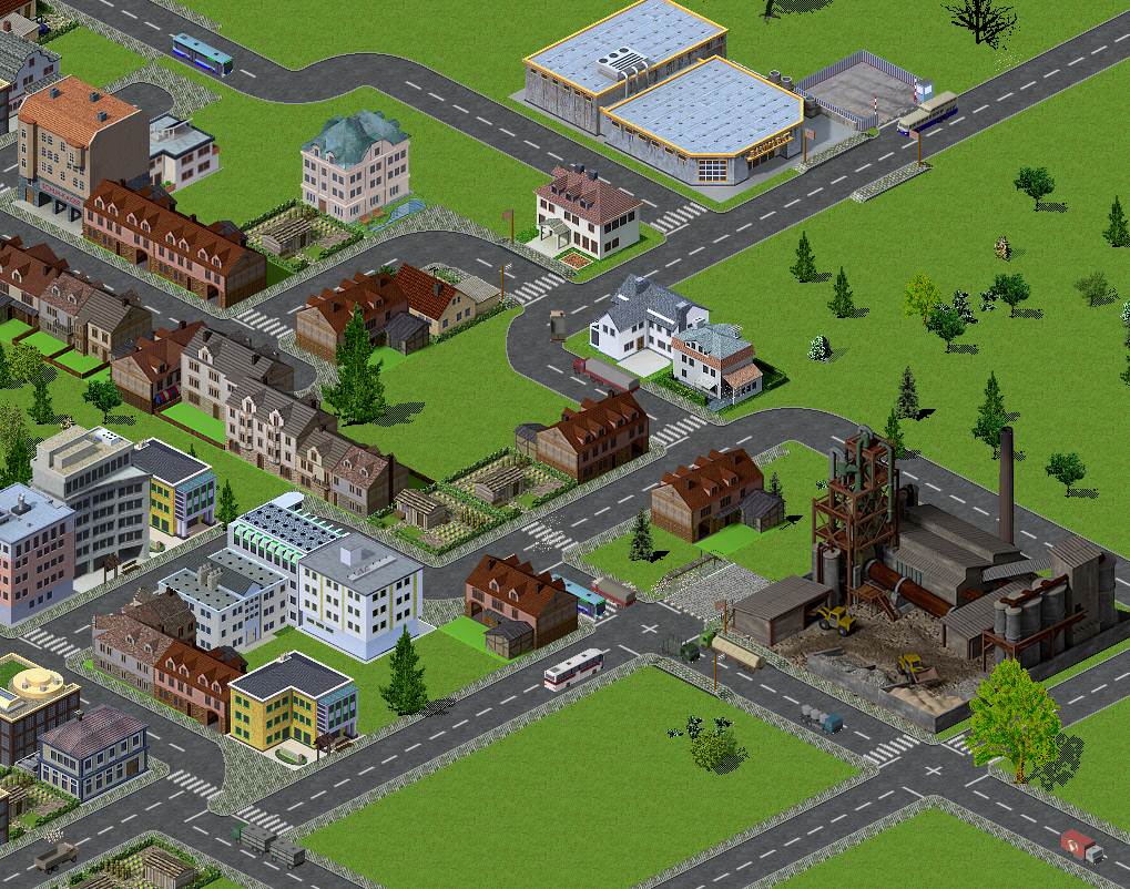 Wie ihr sehen könnt, benutze ich ein wild zusammengestelltes Pakset, um ein paar Gebäudelücken im pak128.german zu füllen. Sogar Gebäude aus dem britischen 128er-Pakset, das sonst eigentlich ästhetisch ziemlich stark vom deutschen pakset abweicht, lassen sich manchmal integrieren. Das meiste allerdings stammt von japanischen Sets (hauptsächlich Infrastrukturgebäude) oder vom pak128.