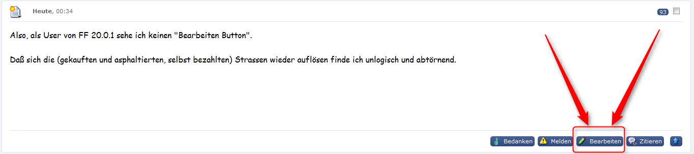 Der Button "Bearbeiten", dessen Position im Screenshot vermerkt ist, dient dazu, in einem Forum bereits getätigte Posts nachträglich zu korrigieren und/oder zu ergänzen. Dadurch ist es nicht notwendig, mehrere Posts hintereinander zu verfassen, sondern wenn man feststellt dass etwas vergessen wurde kann man es bequem anhängen. Dadurch bleiben die Beiträge übersichtlicher, AFAIR ist es sogar eine Nutzungsregel.