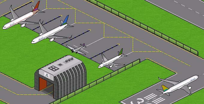 Anstatt eines Werbeplakats hab ich einen Schriftzug in Spielerfarbe an die Rückseite des Hangars angebracht.